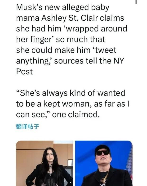 一位名叫艾希莉·圣克莱尔的网红声称,她也在几个月前为马斯克生下了一个儿子。